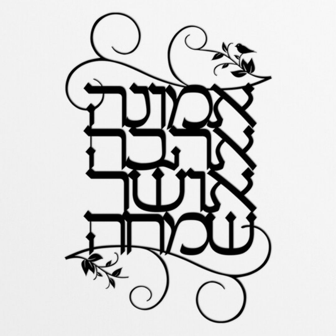 ברכה לבית ממתכת בשילוב המילים "אמונה אהבה אושר שמחה" שורת הערכים החשובים ביותר בבית מאושר ומזכיר את היסודות הבסיסיים לחיים מלאים ומשמעותיים.