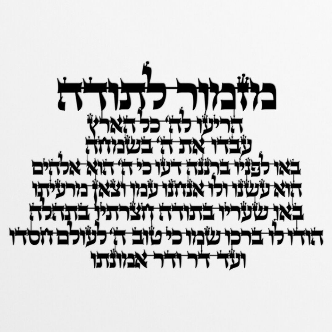 שלט מתכת יוקרתי "מזמור לתודה" באותיות מחוברות – מגיע כחתיכה אחת. משלב ברכה עתיקה בעיצוב זורם ואלגנטי שמביא את תפילת התודה והכרת הטוב אל הבית.